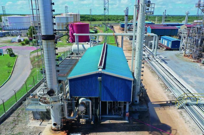Darüber hinaus verfügt es über drei Gasturbinen mit einer Nennleistung von jeweils 30 Megawatt (mw) und eine 70-mw-Anlage mit kombiniertem Zyklus. Nach der Meinung von Fachleuten, aufgrund des Rückgangs in der Leistung der Bohrlöcher des Vorkommens erhält die Anlage heute weniger als 50% des Begleitgases, was dazu führt, dass nur zwei Gasturbinen und der kombinierte Zyklus in Betrieb sind. Die Anlage ist für die Verarbeitung von 1,5 Millionen Kubikmetern Gas pro Tag ausgelegt, und heute erhalten planmäßig 650.000 , sagt der Direktor. Experten zufolge ist dies der beste Weg, um das Gas-Öl-Verhältnis aufrechtzuerhaltn und so eine Erschöpfung des Reservoirs zu vermeiden, was eine kontinuierliche Förderung ermöglicht.