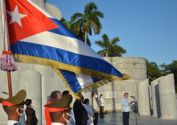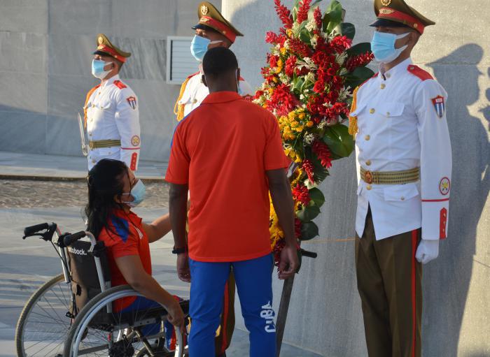 Während des Aktes wurde ein Blumengebinde vor der Statue José Martís von der Gewichtheberin Leydis Rodríguez und dem Läufer Leinier Savón niedergelegt.