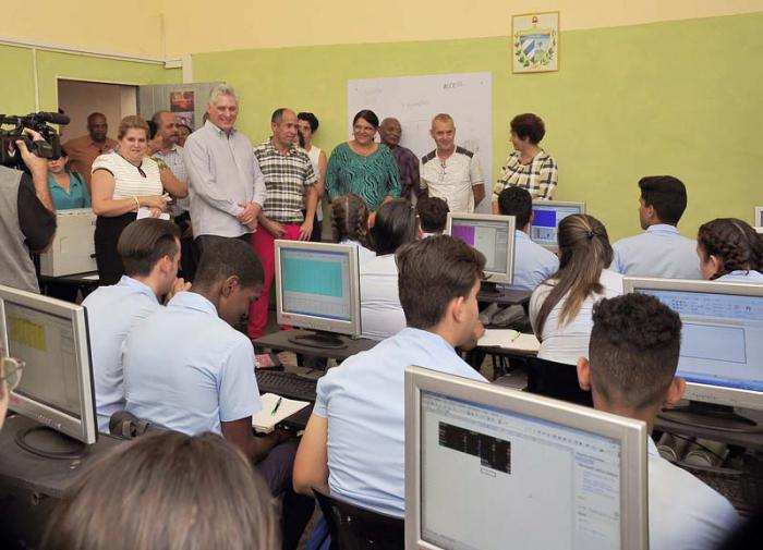 Am Nachmittag ging es weiter mit einem Besuch im Gymnasium Mártires de Porvenir des Stadtbezirks Diez de Octubre, wo 573 junge Menschen lernen. In Begleitung der Bildungsministerin Ena Elsa Velázquez Cobiella besuchte er die Einrichtung, die sich in einem umfassenden Reparatur- und Instandhaltungs-Prozess befindet.