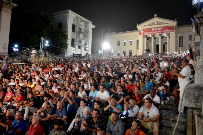 Abschlussveranstaltung des ALBA-Gipfels auf der Freitreppe der Universität mit Armeegeneral Raúl Castro, Präsident Miguel Díaz-Canel, Nicolas Maduro, Venezuela, Daniel Ortega, Nicaragua, und Ralph Gonsalves, San Vicente & Die Grenadinen u. a.Photo: Granma