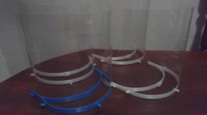 Jede Schutzmaske besteht aus drei Grundkomponenten. Das was ausgedruckt wird, ist die Vorderseite. Außerdem benötigt man noch ein Gummiband als Befestigung und eine Acetatfolie.
