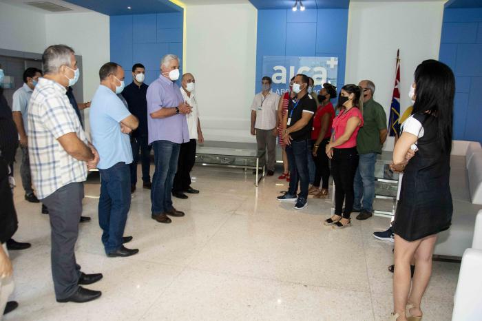 “Wie viele junge Leute es hier gibt...”, sagte Díaz-Canel als er am Hauptgebäude von AICA eintraf, wo er mit den Angestellten über die neuesten Lohnanreize sprach und sie über die produktiven Kapazitäten für die Impfstoffe befragte und ihnen sagte, dass es nötig sei, mehr Personen zu immunisieren und zu impfen.