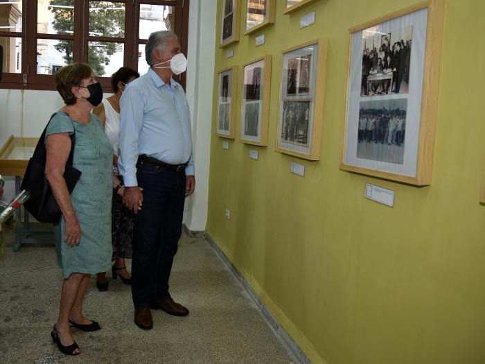 Anschließend besichtigte das Staatsoberhaupt die verschiedenen Bereiche des Polytechnischen Instituts. Der erste Ort war der Besuch einer Galerie, die Momente aus dem Leben von Carlos Rafael Rodríguez zeigt. Präsident Díaz-Canel betrachtete die Bilder mit Dania, der Tochter des außergewöhnlichen Denkers, und anderen Verwandten des Mannes, nach dem das Zentrum benannt ist.