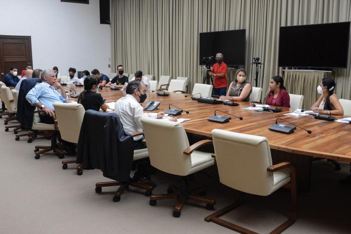 Bei dem Treffen, an dem auch Aylín Álvarez García, erste Sekretärin der UJC, und Karla Santana Rodríguez, Präsidentin der FEU, teilnahmen, sprach der Präsident mit den Jugendlichen über die aktuelle Situation in Kuba, die aufgrund der Auswirkungen von COVID-19 und der Verschärfung der US-Blockade sehr komplex ist, sowie über die grundlegende Rolle, die die Jugendlichen in dieser schwierigen Zeit gespielt haben.