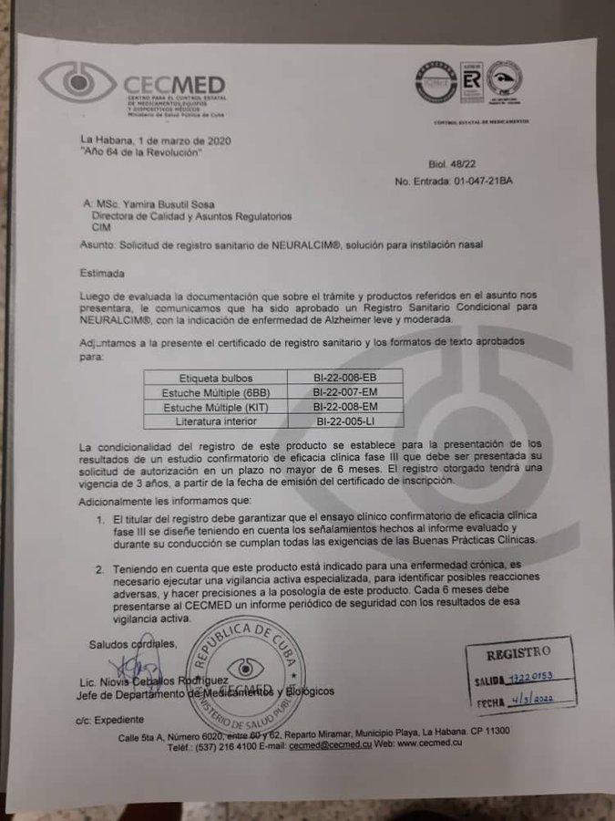 Laut dem von Cecmed herausgegebenen Dokument wurde die Registrierung für NeuralCim (der Handelsname von NeuroEpo) nach Bewertung der von CIM eingereichten Unterlagen genehmigt.