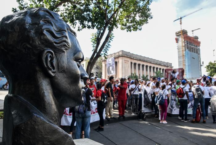 Nach der Ehrung des Studentenführers und Gründers der FEU, Julio Antonio Mella, am Denkmal, das ihm gewidmet ist, stiegen die jungen Leute die Treppe der Universität hinauf, um an der Parade und der offiziellen Präsentation teilzunehmen, die innerhalb der Einrichtung stattfand.