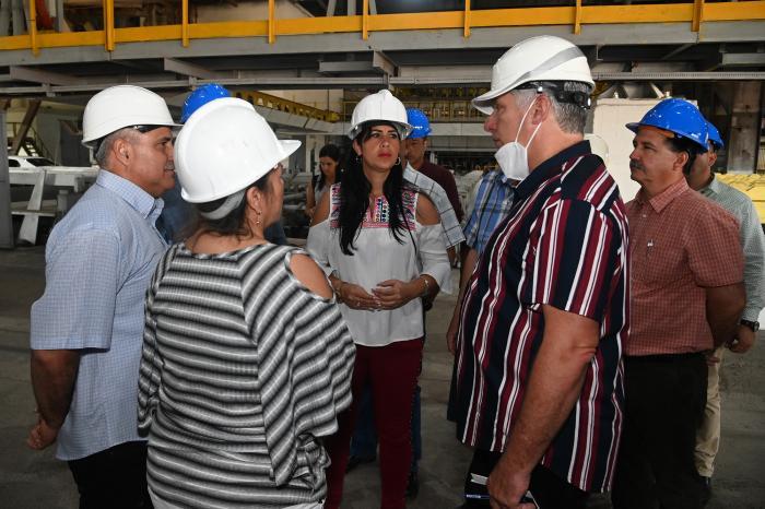 Der Leitung und Arbeitern sagte Díaz-Canel: "Wir müssen dafür sorgen, dass die Menschen, die hier arbeiten, gut verdienen, denn das ist harte Arbeit. Außerdem befinden wir uns in einem der am weitesten entwickelten Werke des Landes: Hier müssen die Löhne gut sein".