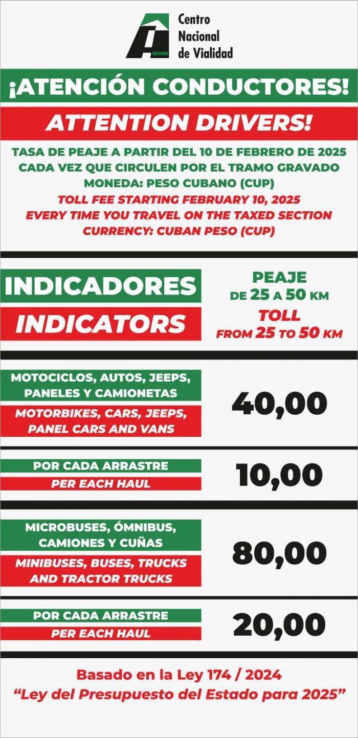 Die Mautgebühr in Kuba wurde durch das Abkommen VII-78 von 2012 der Nationalversammlung der Volksmacht eingeführt, die einstimmig das Gesetz Nr. 113, Gesetz über das kubanische Steuersystem, verabschiedet hat, das in seinem vierten Buch, Titel I, enthalten ist, und zu dessen Zahlung alle kubanischen oder ausländischen Fahrer von Kraftfahrzeugen im Landverkehr verpflichtet sind, die auf den mit dieser Steuer besteuerten Straßenabschnitten verkehren, die vollständig in den Staatshaushalt fließt und eine Finanzierungsquelle für diesen darstellt.