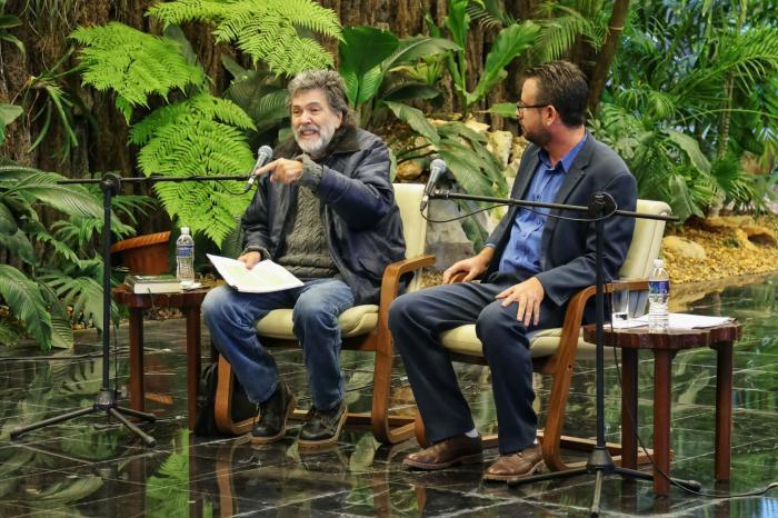 Abel Prieto Jiménez begann sein Gespräch mit den rund hundert jungen Leuten, die sich im Portocarrero-Saal versammelt hatten, und mit dem gesamten Publikum mit einem bemerkenswerten Detail: Er merkte an, dass viele zum ersten Mal hier seien und dass der Saal seinen Namen einem Werk der kubanischen Avantgarde-Kunst von René Portocarrero verdanke. Er sprach über das exquisite Glasfenster „Sonne der Amerikanischen Revolution“ des kubanischen Künstlers Mario Gallardo im Palast; und fuhr fort, dass „hier Farne aus der Sierra Maestra, aus dem Escambray-Gebirge, wachsen …“