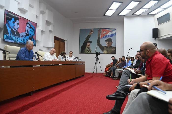 Díaz-Canel erörterte mit den Anwesenden die Rolle der kubanischen Presse „als ideologisches und kulturelles Bollwerk im gegenwärtigen Szenario eines Krieges der sechsten Generation“. Es handele sich um eine Konfrontation – erinnerte er sie und wiederholte frühere Analysen –, die sich als ideologischer Krieg, Kulturkrieg, Medienkrieg und Kommunikationskrieg entfalte; „deshalb stehen Sie an vorderster Front“, bekräftigte er. Eine Frontlinie – so argumentierte er –, an der es notwendig sei, die Kommunikationsmittel bestmöglich zu nutzen, die die hegemonialen Mächte selbst geschaffen haben, um ihre Hegemonie durchzusetzen.