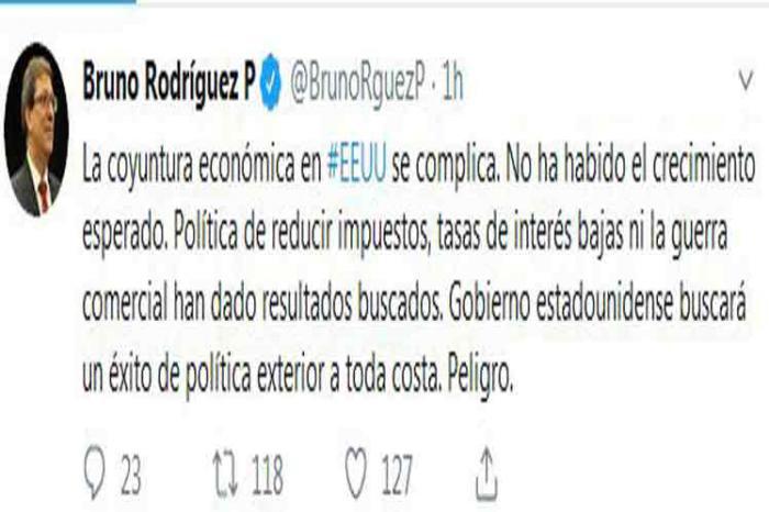 Der kubanische Außenminister Bruno Rodríguez warnte am Sonntag, dass die Regierung der USA angesichts der schwierigen wirtschaftlichen Lage, die das Land durchlaufe, um jeden Preis einen Erfolg in seiner Außenpolitik suchen könne.
