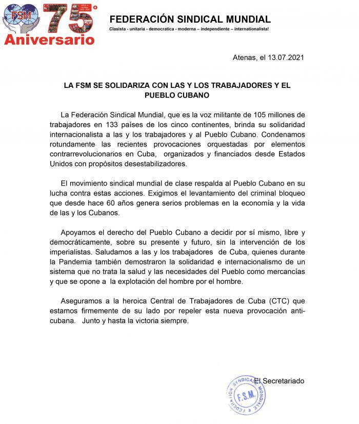 Der Weltgewerkschaftsbund, der die kämpferische Stimme von 105 Millionen Arbeitern in 133 Ländern auf fünf Kontinenten ist, entbietet den Arbeitern und dem kubanischen Volk seine internationalistische Solidarität. Wir verurteilen aufs Schärfste die jüngsten Provokationen, die von konterrevolutionären Elementen in Kuba orchestriert und von den Vereinigten Staaten zu destabilisierenden Zwecken organisiert und finanziert werden.