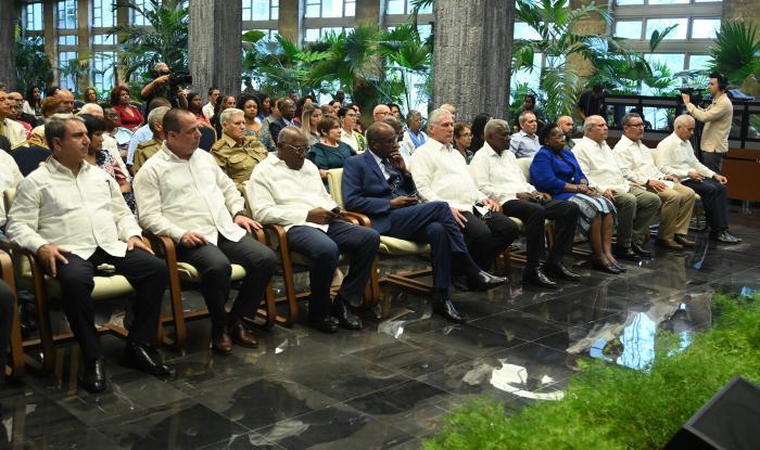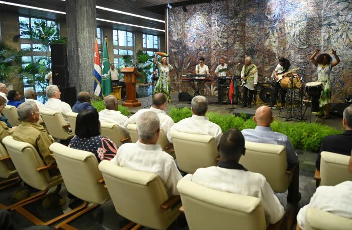 Seine Exzellenz Nasser Mohamed Ousbo, Botschafter der Republik Dschibuti und Dekan des in Havanna akkreditierten Afrikanischen Diplomatischen Korps, dankte dem kubanischen Volk und der kubanischen Regierung, „die dem afrikanischen Kontinent immer nahe gestanden und seine Freuden und Leiden geteilt haben“.