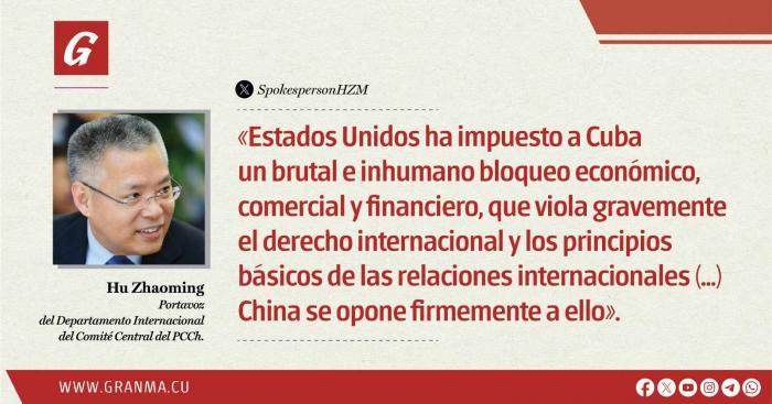 Der Sprecher der Internationalen Abteilung des Zentralkomitees der Kommunistischen Partei Chinas (KPCh), Hu Zhaoming, betonte Chinas Verurteilung der Blockade und der Sanktionen gegen Kuba, die er als Verletzung grundlegender internationaler Gesetze und Prinzipien und als Verstoß gegen die grundlegenden Menschenrechte der Bevölkerung des Archipels bezeichnete.