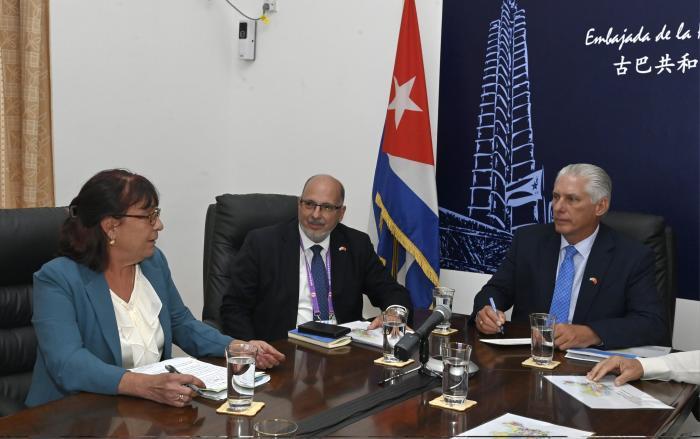 Der Erste Sekretär des Zentralkomitees der Partei und Präsident der Republik unterhielt auch einen Austausch mit Mitgliedern der kubanischen Staatsmission in China, dem diplomatischen Personal und den Mitarbeitern der Botschaft.